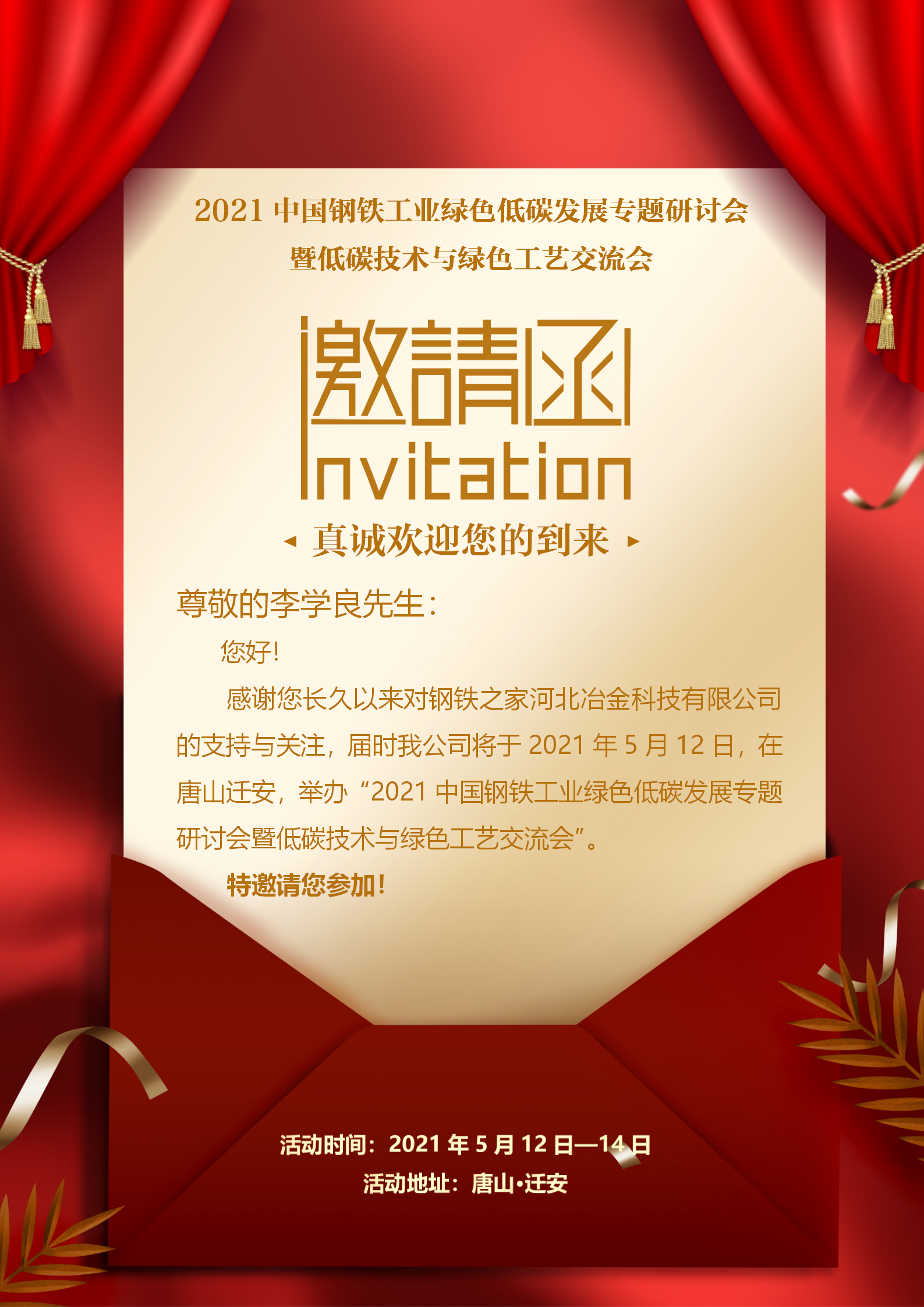 良慧环保李学良受邀参加“2021中国钢铁工业绿色低碳发展专题研讨会”2021/5/12 10:35:205.13日,“2021中国钢铁工业绿色低碳发展专题研讨会”将在河北省唐山市迁安市召开,此次研讨会由京津冀钢铁....点击阅读全文>>